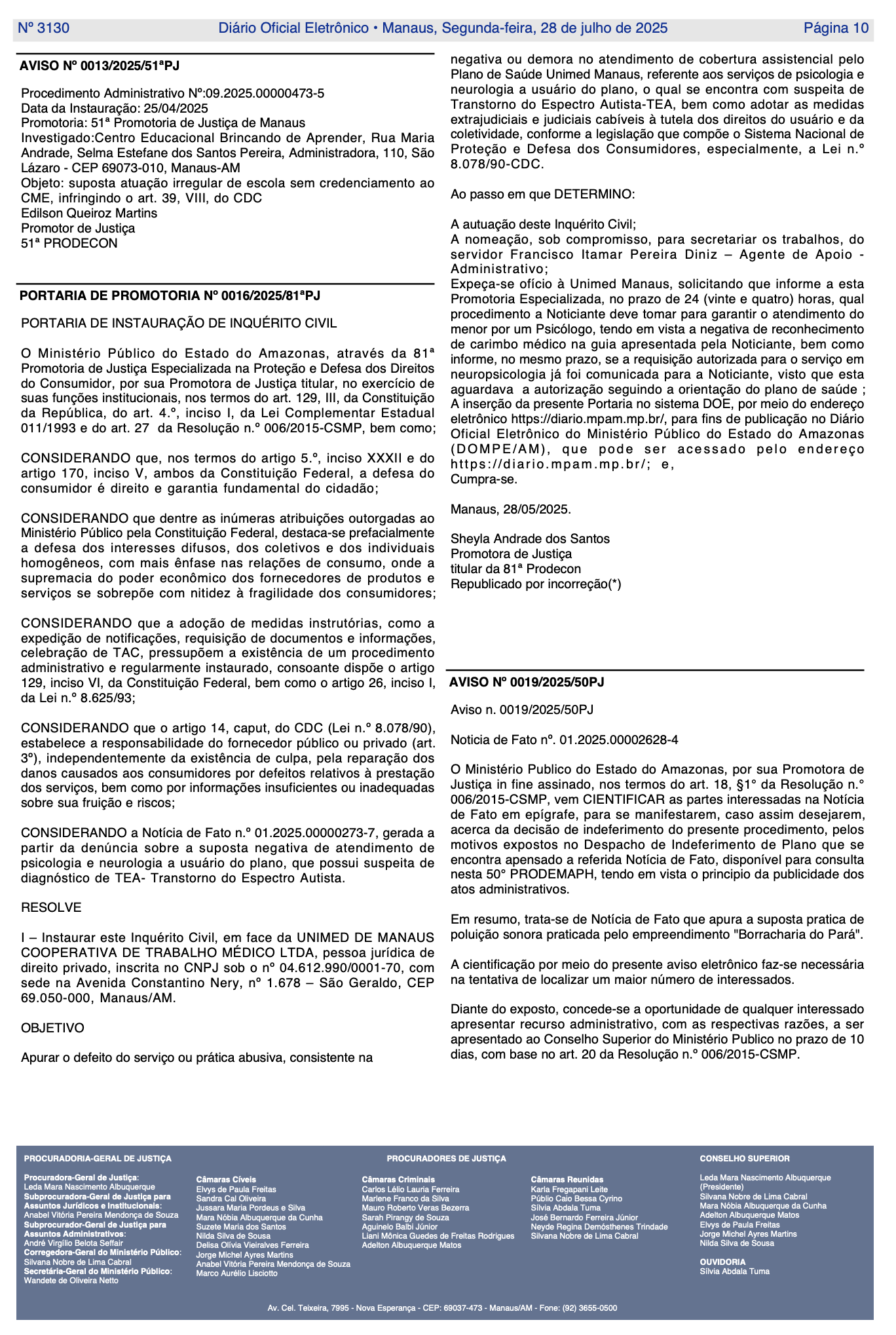 Na portaria de instauração, a Unimed Manaus foi notificada a apresentar esclarecimentos à Promotoria no prazo de 24 horas. A cooperativa deverá explicar quais os procedimentos exigidos para que a família consiga atendimento psicológico e se a solicitação para atendimento em neuropsicologia já foi formalmente respondida. O documento também determina a publicação do ato no Diário Oficial Eletrônico do MP-AM e nomeia o servidor Francisco Itamar Pereira Diniz como secretário dos trabalhos do inquérito.