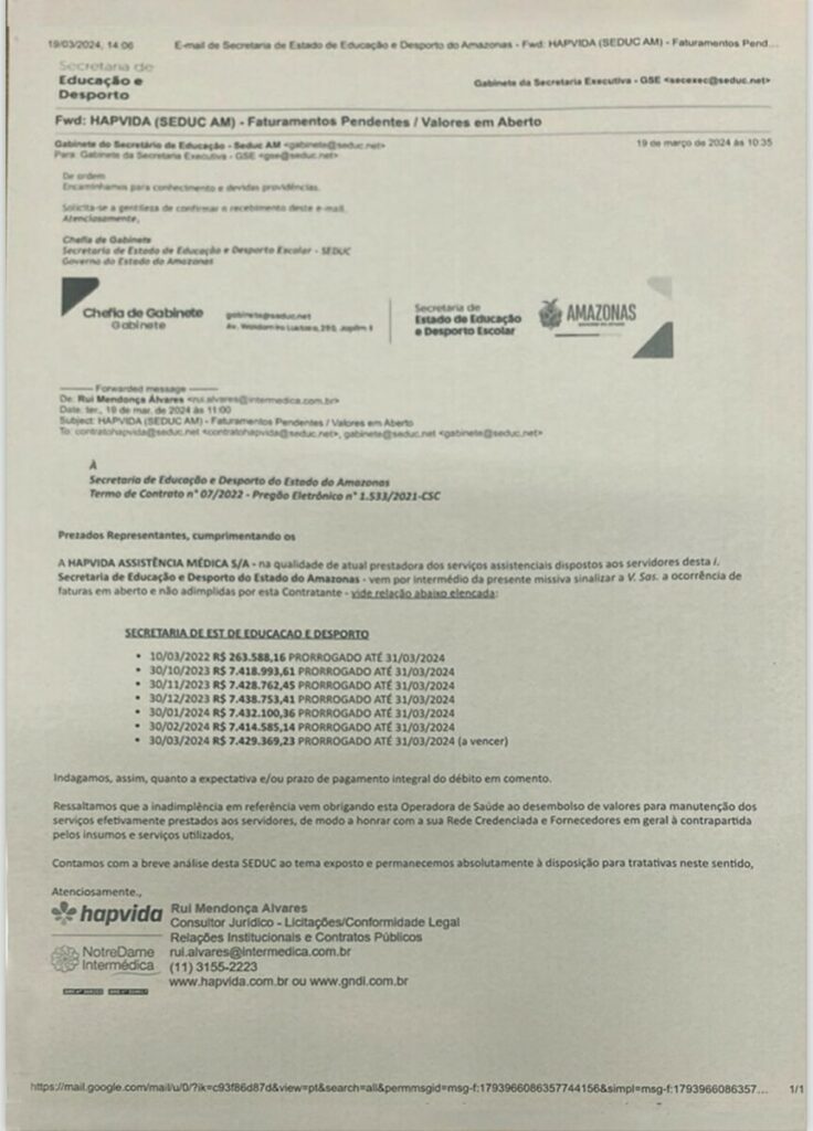 Em um vídeo publicado, ela mostra um documento que comprova que a Secretaria de Educação do Amazonas (Seduc) está com o pagamento da empresa Hapvida, responsável pelo plano de saúde dos educadores, atrasado há 7 meses.