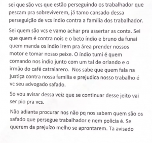 “Sei que quem é contra nós é o Beto Índio e Bruno da Funai, quem manda os índios irem para área prender nossos motores e tomar nosso peixe. Só vou avisar dessa vez, que se continuar desse jeito, vai ser pior para vocês. Melhor se aprontarem. Tá avisado”.