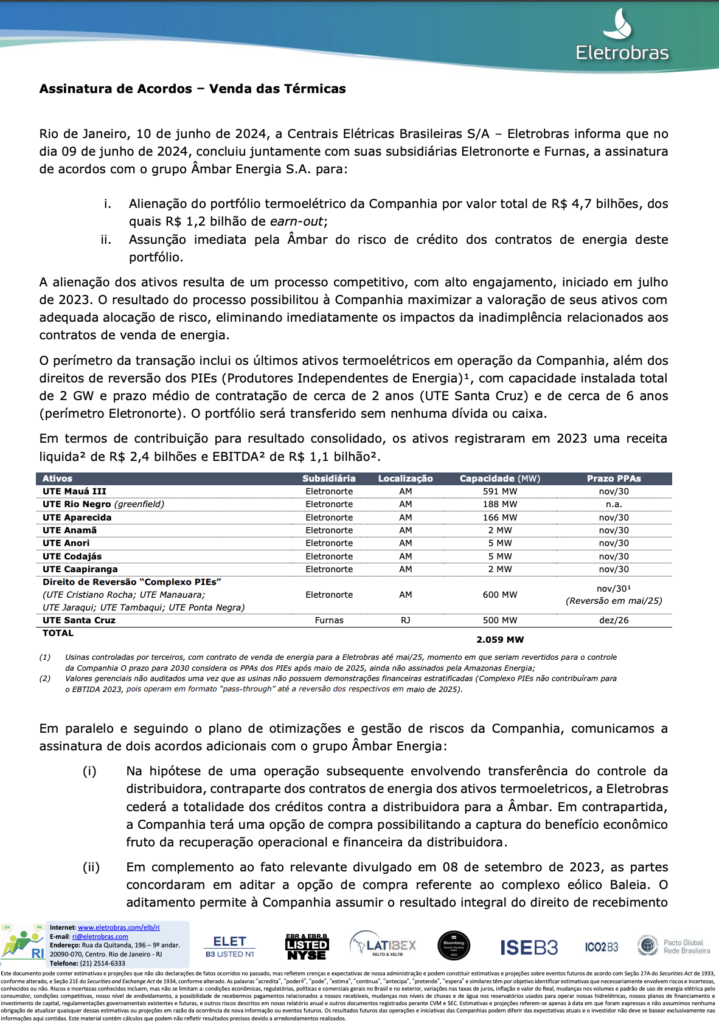 Brasil – Uma decisão contundente do Tribunal Regional Federal da 1ª Região (TRF-1) interrompeu nesta segunda-feira (6) a venda de termoelétricas da Eletrobras no Amazonas para a Âmbar Energia, empresa do grupo J&F, controlada pelos irmãos Joesley e Wesley Batista. A liminar, assinada pelo juiz federal Ney Bello, anulou a conversão dos contratos de compra e venda de energia para Contratos de Energia de Reserva (CER) e determinou que a Cigás (Companhia de Gás do Amazonas) tenha anuência prévia para qualquer mudança contratual.