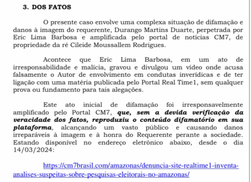 Durango Martins Duarte alegou ter sido difamado por um vídeo divulgado por Eric Lima Barbosa. Segundo a denúncia, o vídeo estaria acusando falsamente Duarte de envolvimento em atividades ilícitas e de ter ligações com uma matéria publicada pelo portal Real Time1.