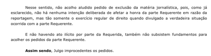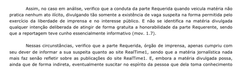 O magistrado citou jurisprudências e fundamentos constitucionais que asseguram a liberdade de imprensa e o direito à informação verdadeira. Ele afirmou que não identifica na matéria divulgada qualquer intenção de difamação gratuita e que o conteúdo veiculado pelo CM7 Brasil apenas cumpriu com o dever de informar.
