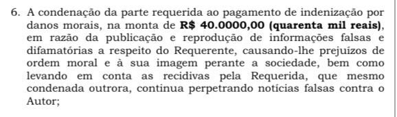 A acusação foi replicada pelo Portal CM7 Brasil, o que levou Duarte a afirmar que sua imagem e honra foram irreparavelmente danificadas pelo veículo perante a sociedade, pedindo assim R$ 40 mil reais de indenização pelos “danos”.
