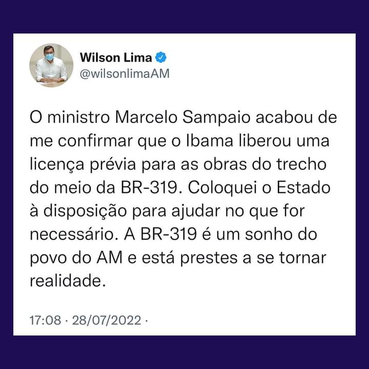 Wilson Lima comemora liberação de licença prévia para reconstrução da BR-319; “Um sonho para o povo do AM”