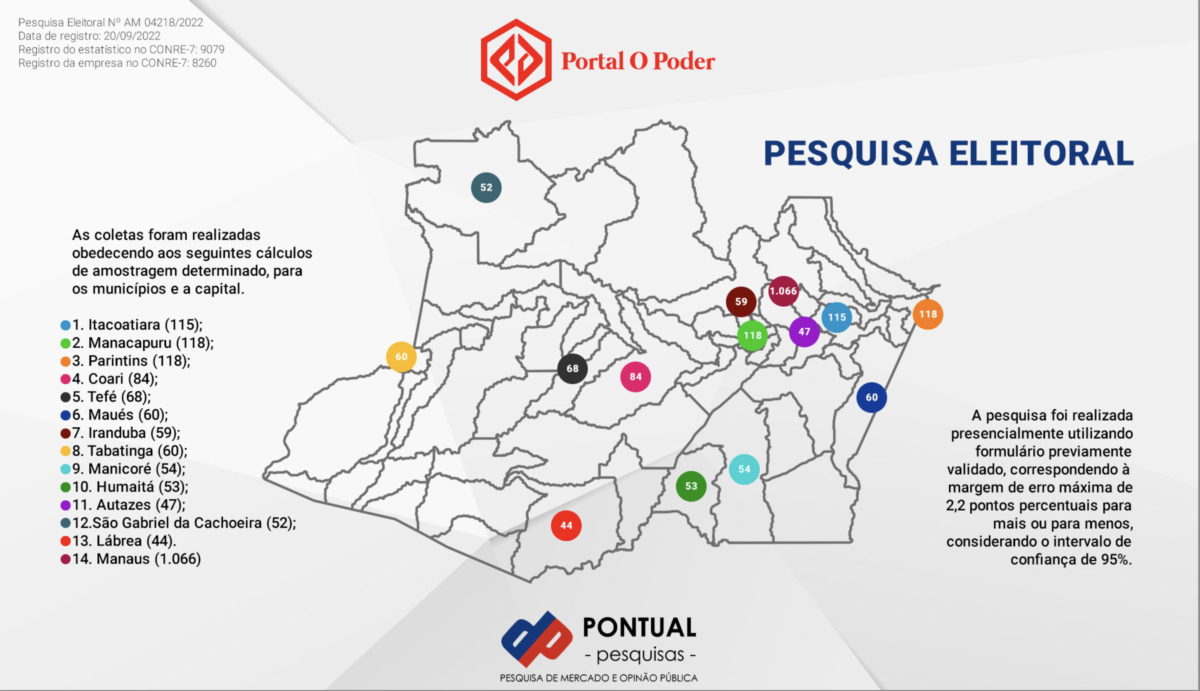 A pesquisa foi realizada em 13 municípios do interior do Amazonas, além da capital Manaus, com eleitores com 16 anos ou mais, com registro eleitoral no município de Manaus e nos 13 municípios e aptos a votar nas Eleições Gerais no Brasil para 2022. A metodologia aplicada pela Pontual Pesquisas obedece à técnica de pesquisa transversal do tipo quantitativa.