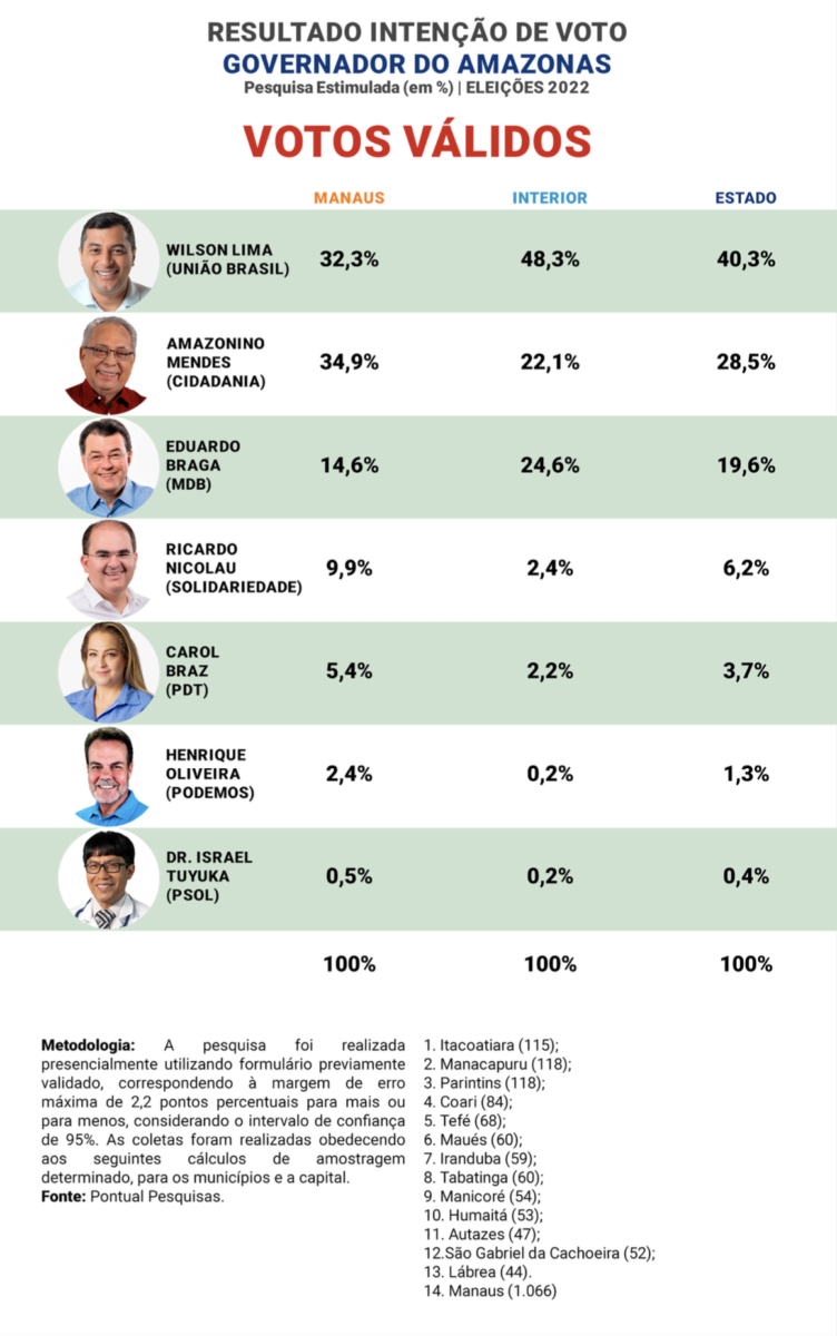 Quanto aos votos válidos, o governador Wilson Lima desponta na liderança. A Pontual Pesquisas indica que o candidato à reeleição tem 40,3% dos votos válidos. O segundo colocado, Amazonino Mendes, registrou 28,5%.