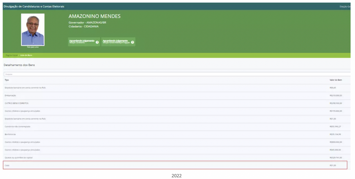 Amazonas – O pré-candidato ao Governo do Estado, Amazonino Mendes (Cidadania), incluiu em sua declaração de bens, entregue à Justiça Eleitoral, para compor o processo de homologação de sua candidatura, depósito bancários em contas correntes do País nos valores de R$ 0,45 e R$ 1, respectivamente, além de uma casa no valor de R$ 1.