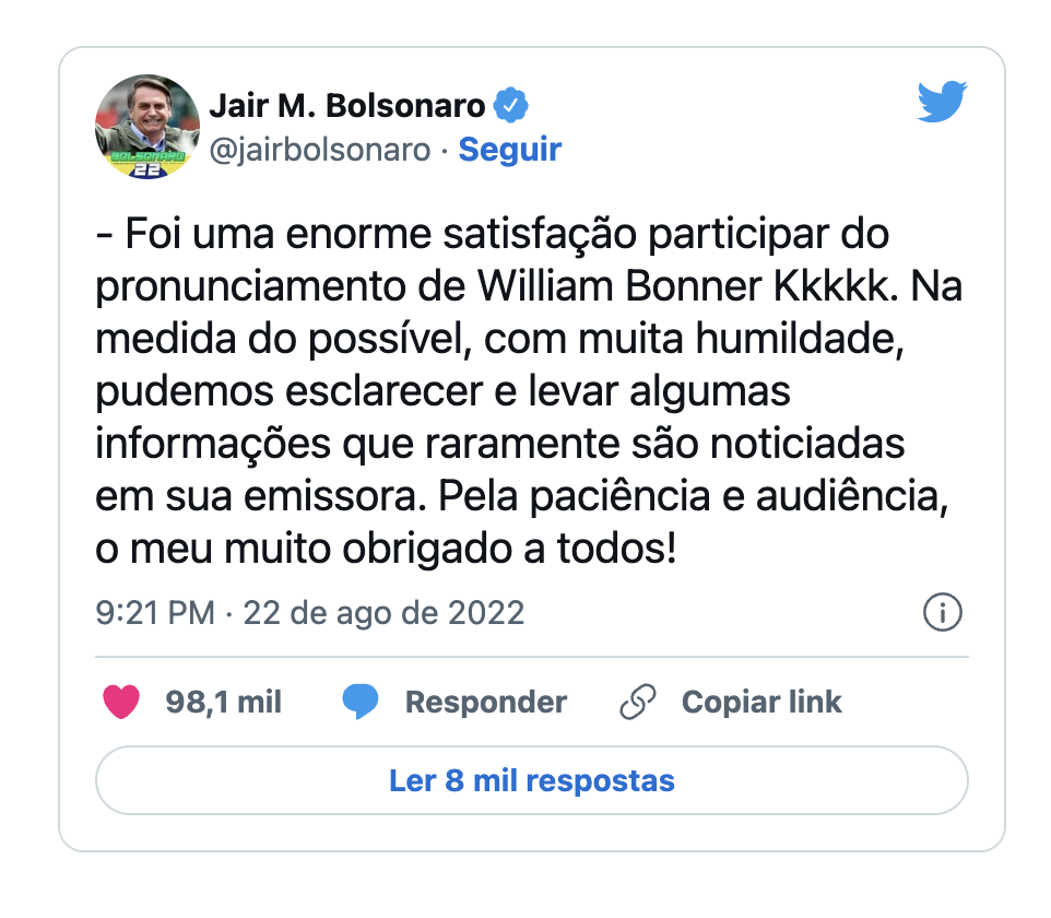 Brasil – O presidente Jair Bolsonaro (PL) fez um comentário sobre a postura do jornalista William Bonner durante a entrevista ao Jornal Nacional, da Rede Globo, nesta segunda-feira (22). Em publicação nas redes sociais, logo após a sabatina no telejornal, o chefe do Executivo disse que foi “uma enorme satisfação participar do pronunciamento de William Bonner”.