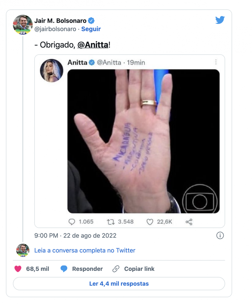 O presidente também ironizou a cantora Anitta, que repostou a imagem que mostrava a cola na palma da mão esquerda do presidente.