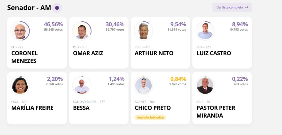 Amazonas – E a apuração das urnas eletrônicas pelo Tribunal Superior Eleitoral (TSE), aponta Coronel Menezes (PL) na liderança pela única vaga ao Senado no Amazonas. A colocação do aliado do atual presidente Bolsonaro, deixa Arthur Neto (PSDB) no fim da fila.