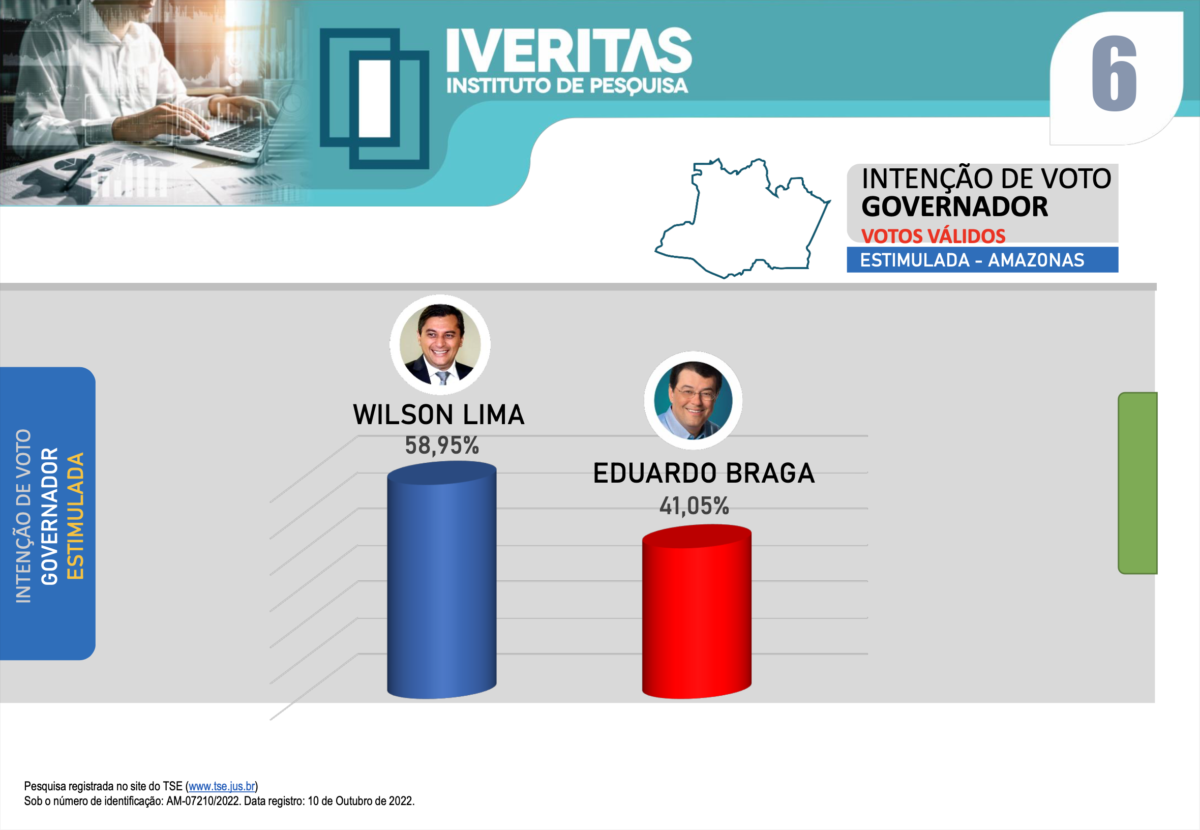 Amazonas – Pesquisa feita pelo Instituto Iveritas, registrada no Tribunal Superior Eleitoral com o número AM-07210/2022, na data de 10/10/2022, em que foram ouvidas 2.912 pessoas presencialmente em Manaus, Iranduba, Manacapuru, Presidente Figueiredo, Rio Preto da Eva, Itacoatiara, Maués, Parintins, Autazes, Coari e Tefé, confirma a liderança de Wilson Lima, com 58,95% dos votos válidos, seguido de Eduardo Braga com 41,05%.