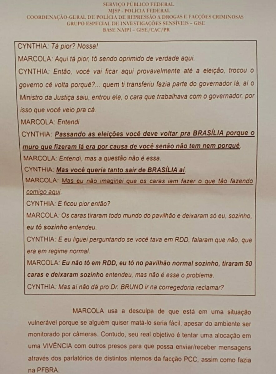 “Aqui tá pior, tô sendo oprimido de verdade aqui”, relata Marcola. Ao responder, Cynthia relaciona seu possível retorno à capital federal ao atual processo eleitoral e cita uma obra realizada no presídio. “Então, você vai ficar aqui provavelmente até a eleição, trocou o governo cê volta (sic) passando as eleições, você deve voltar para Brasília porque o muro que fizeram lá era por causa de você.”
