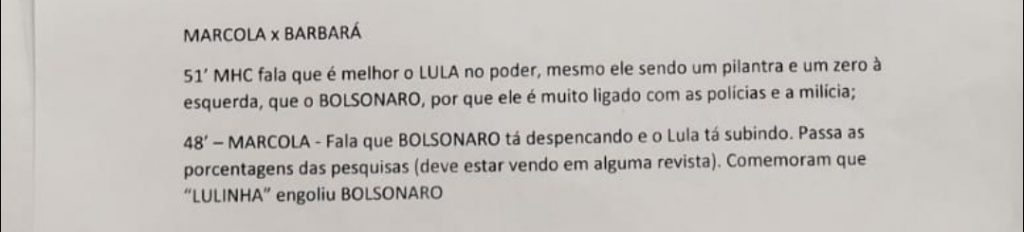 “Ah, mas… para nós o Bolsonaro é pior (…) O Lula é ladrão mesmo, pilantra entendeu… só que é o seguinte, irmão. Essa fita do Covid mesmo, o Bolsonaro deu uma mancada. Bolsonaro é parceiro da política, da milícia. Cara é sem futuro. O Lula também é sem futuro, só que entre os dois, não dá nem para comparar um com o outro“, responde Marcola.