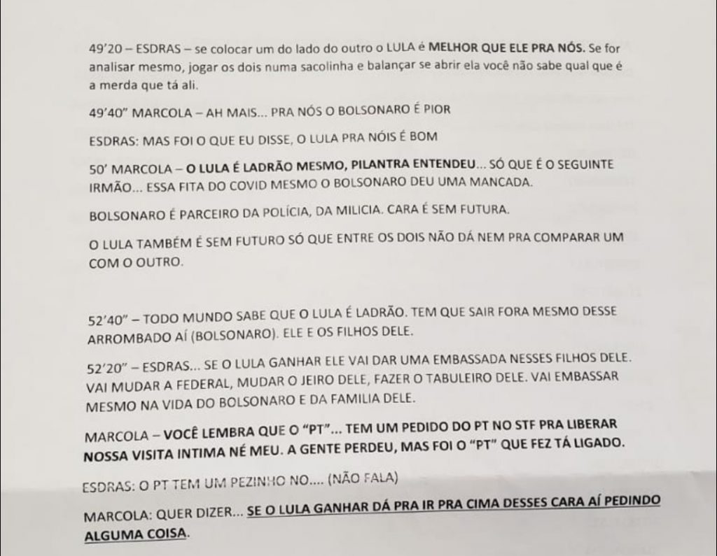 A preferência dos criminosos por Lula como presidente é explicitada em outra conversa captada pela Polícia Federal entre Marcola e Esdras Augusto do Nascimento Júnior. “Se colocar um do lado do outro, o Lula é melhor que ele para nós. Se for analisar mesmo, jogar os dois numa sacolinha e balançar. Se abrir ela, você não sabe qual que é a merda que tá ali”, diz Esdras.