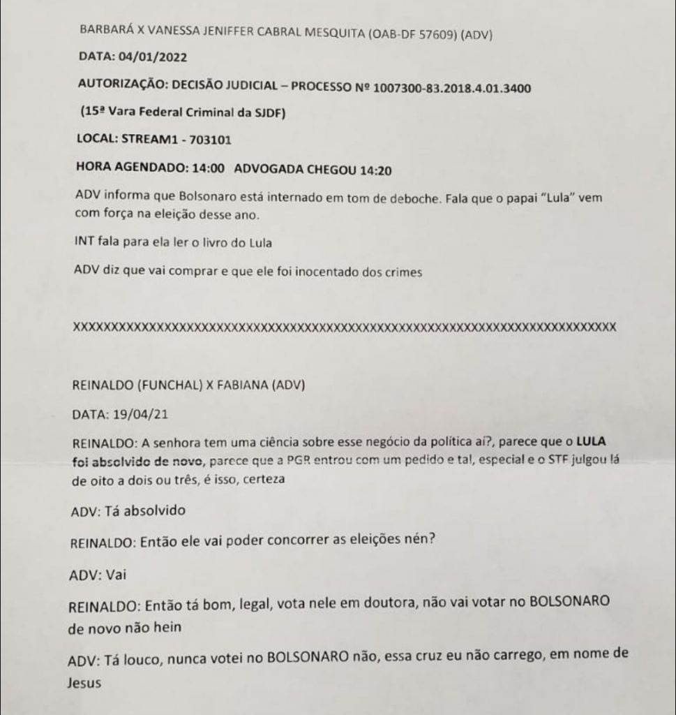 Reinaldo Teixeira dos Santos, o Funchal, também trata do cenário eleitoral com uma advogada, identificada apenas como Fabiana. No diálogo, ele diz que “Lula foi absolvido de novo” e pergunta se o petista poderá concorrer à Presidência da República. Ela responde positivamente. Os dois fazem piada com a disputa. Funchal foi condenado pelo assassinato do juiz corregedor Antônio José Machado Dias, em 2003.