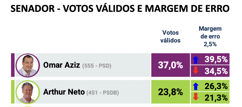 A pesquisa confirma tendência dos grandes institutos nacionais ao apontar a liderança do parlamentar para a reeleição no Senado Federal. Na apuração dos votos válidos, o Senador da Vida aparece com 37%, contra 23,8% do segundo colocado e 22,3% do terceiro. Mesmo aplicada a margem de erro da pesquisa de 2,5%, Omar Aziz ainda fica com 34,5% das intenções de voto, representando larga vantagem entre os demais candidatos. São números semelhantes aos divulgados pelo Instituto Ipec (antigo Ibope) e Quaest.