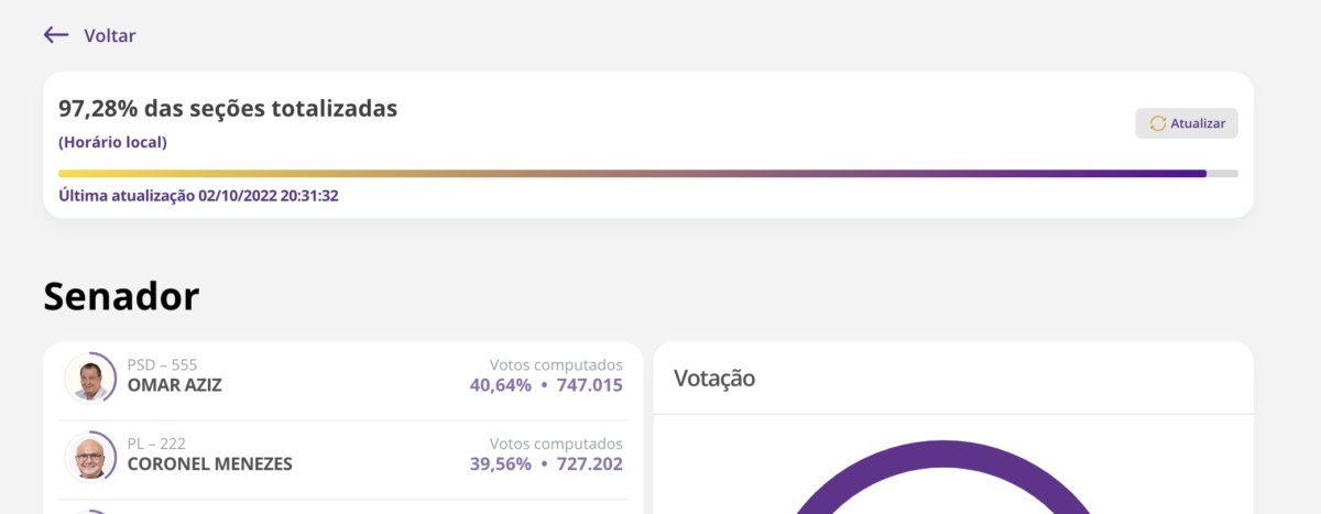 Agora, com 97,16% das urnas apuradas, Omar lidera com 747.015 mil votos, contra o 727.202 mil de Menezes. Com isso, Aziz fará mais um mandato de oito anos.
