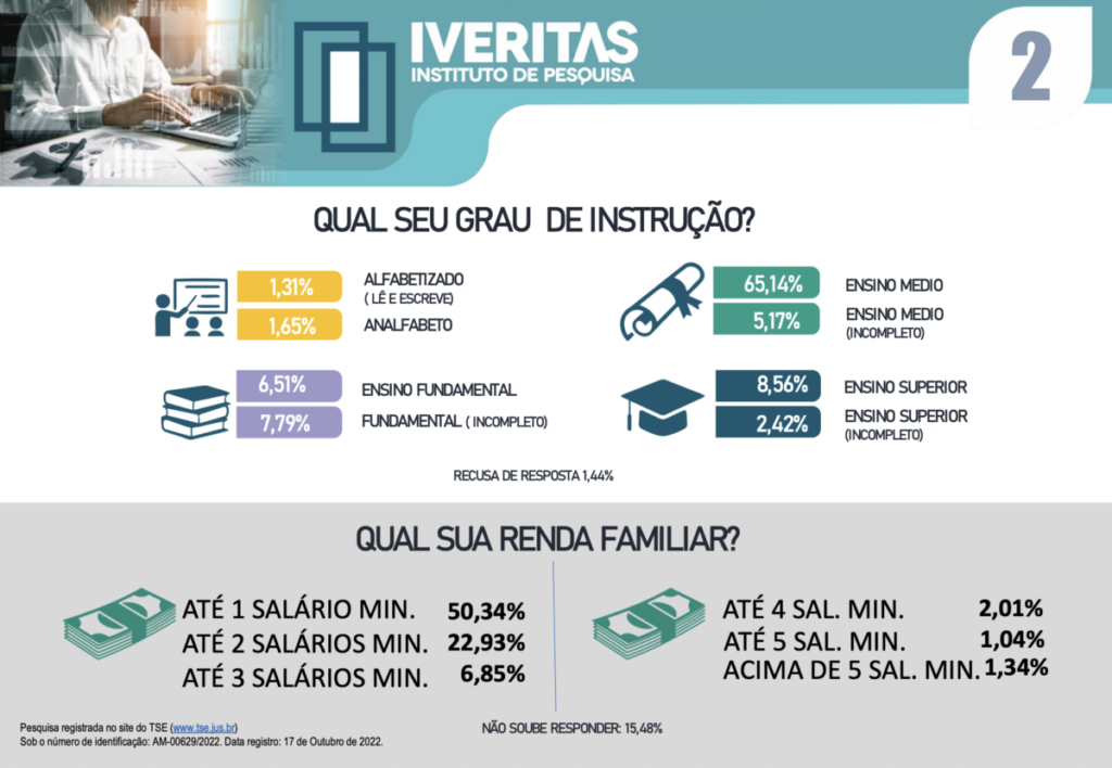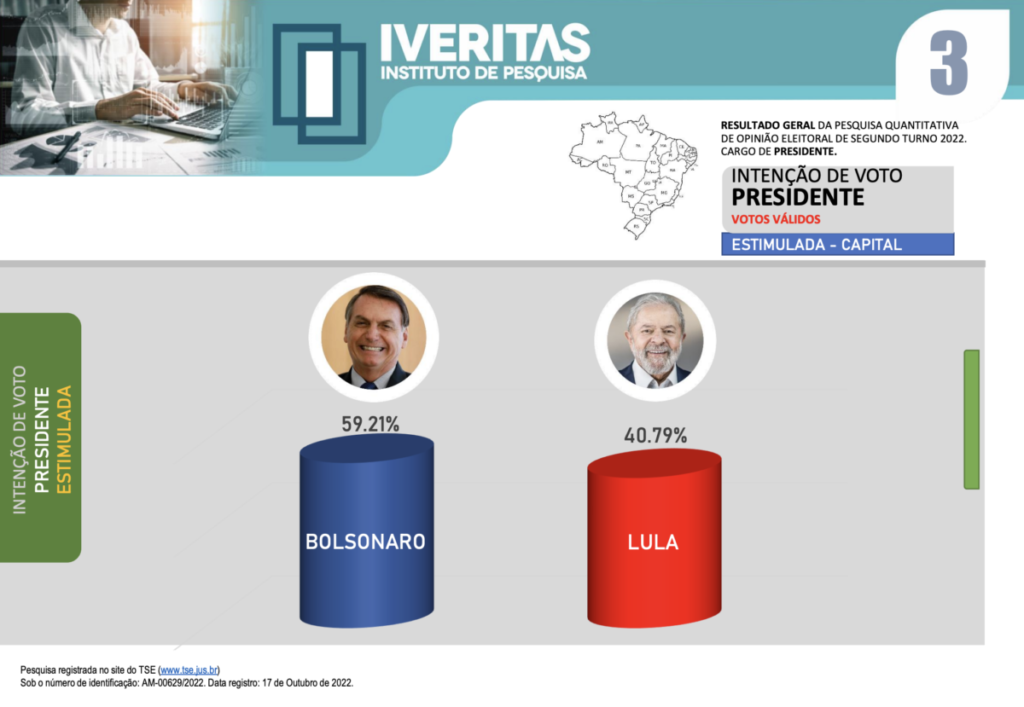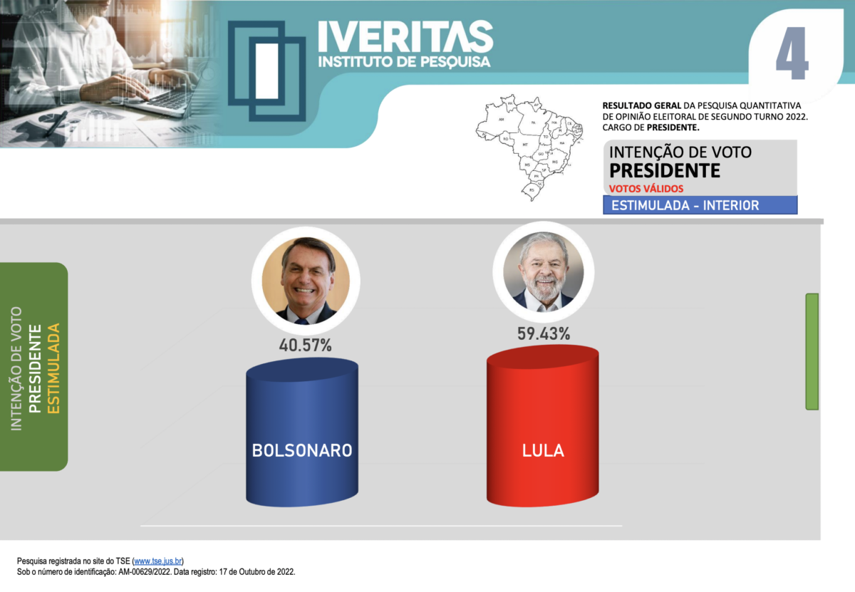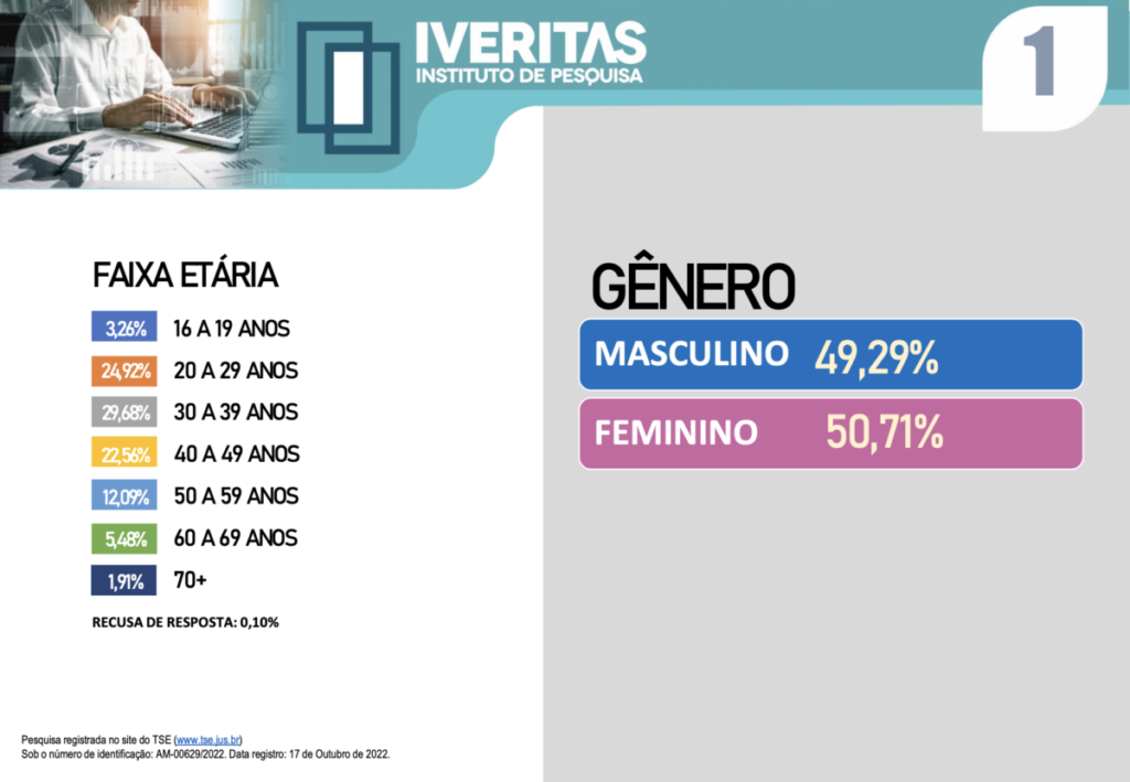 A pesquisa foi registrada no Tribunal Superior Eleitoral sob o número de identificação: AM-00629/2022, na data de 17 de Outubro de 2022. Confira a pesquisa na íntegra: