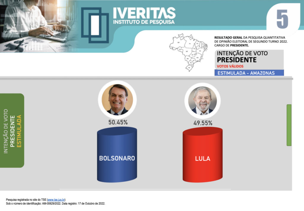 Amazonas – Segundo o levantamento do Instituto de Pesquisa Veritas, o atual presidente e candidato à presidência, Jair Bolsonaro (PL), vencerá no estado do Amazonas no segundo turno por 50,45% contra 49,55% dos votos válidos.