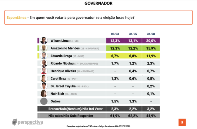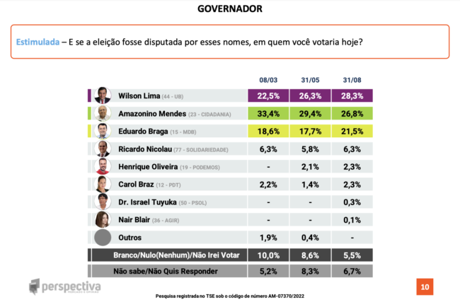 Amazonas – A 3ª pesquisa Perspectiva para presidente, governador e senador do Amazonas, divulgada no fim da noite de terça-feira (30), e apontou o governador e candidato à reeleição, Wilson Lima (União Brasil), como o postulante ao cargo com o maior percentual de intenções de votos e isolado na liderança na categoria ‘espontânea’, em que ele aparece 4,1 pontos percentuais à frente do segundo colocado, Amazonino mendes (Cidadania).