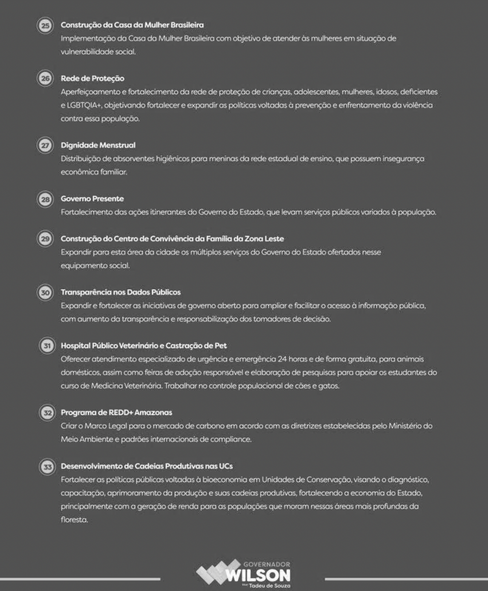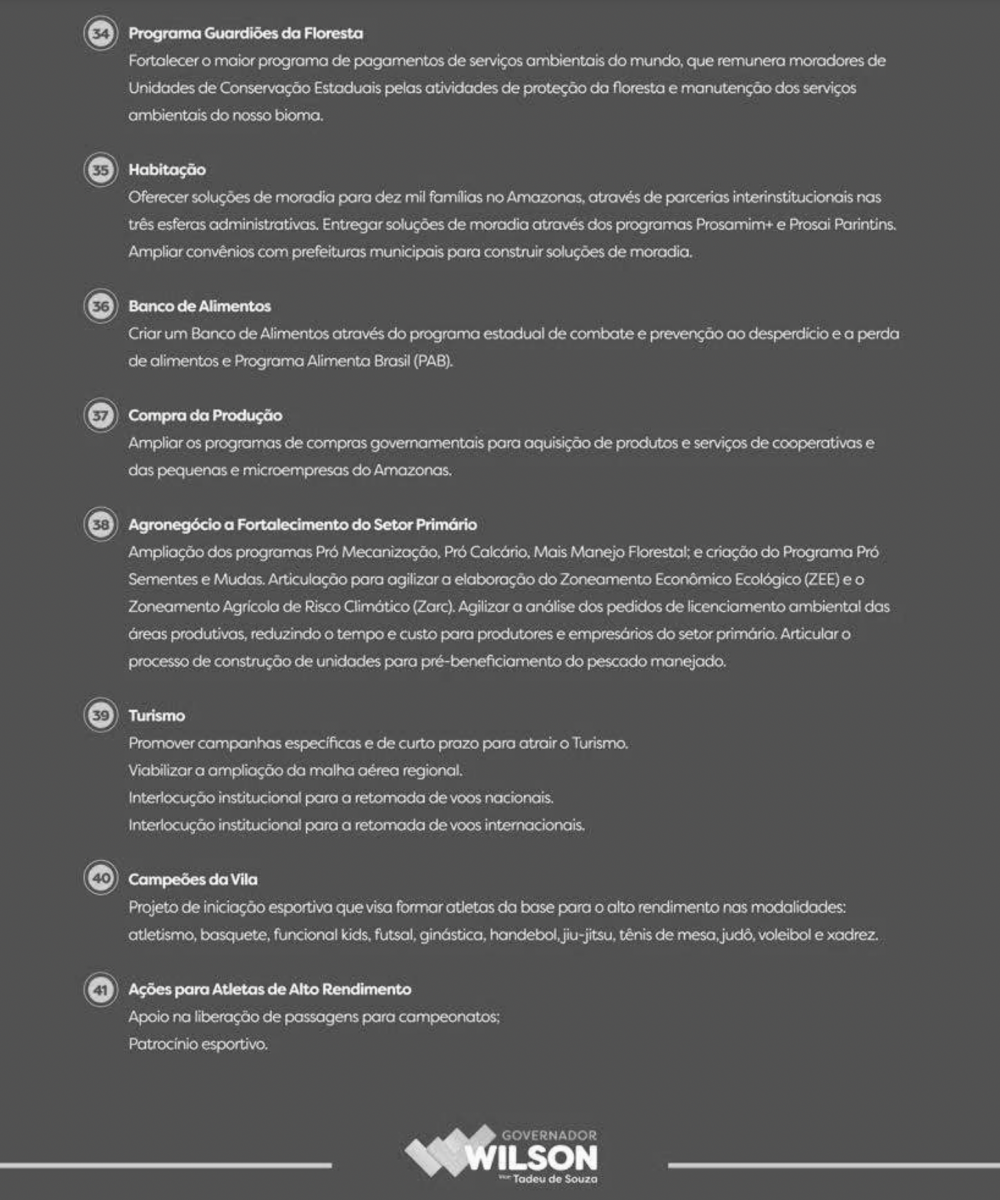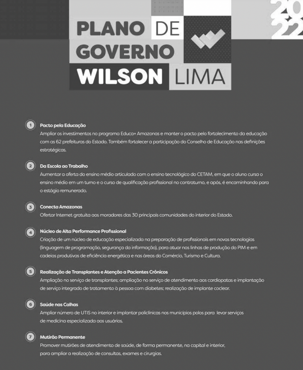Essa são algumas das propostas do plano de governo de Wilson Lima (União Brasil), apresentado à Justiça Eleitoral, logo após registrar a sua candidatura. Veja na íntegra todas as propostas apresentadas pelo governador que concorre à reeleição nestas eleições: