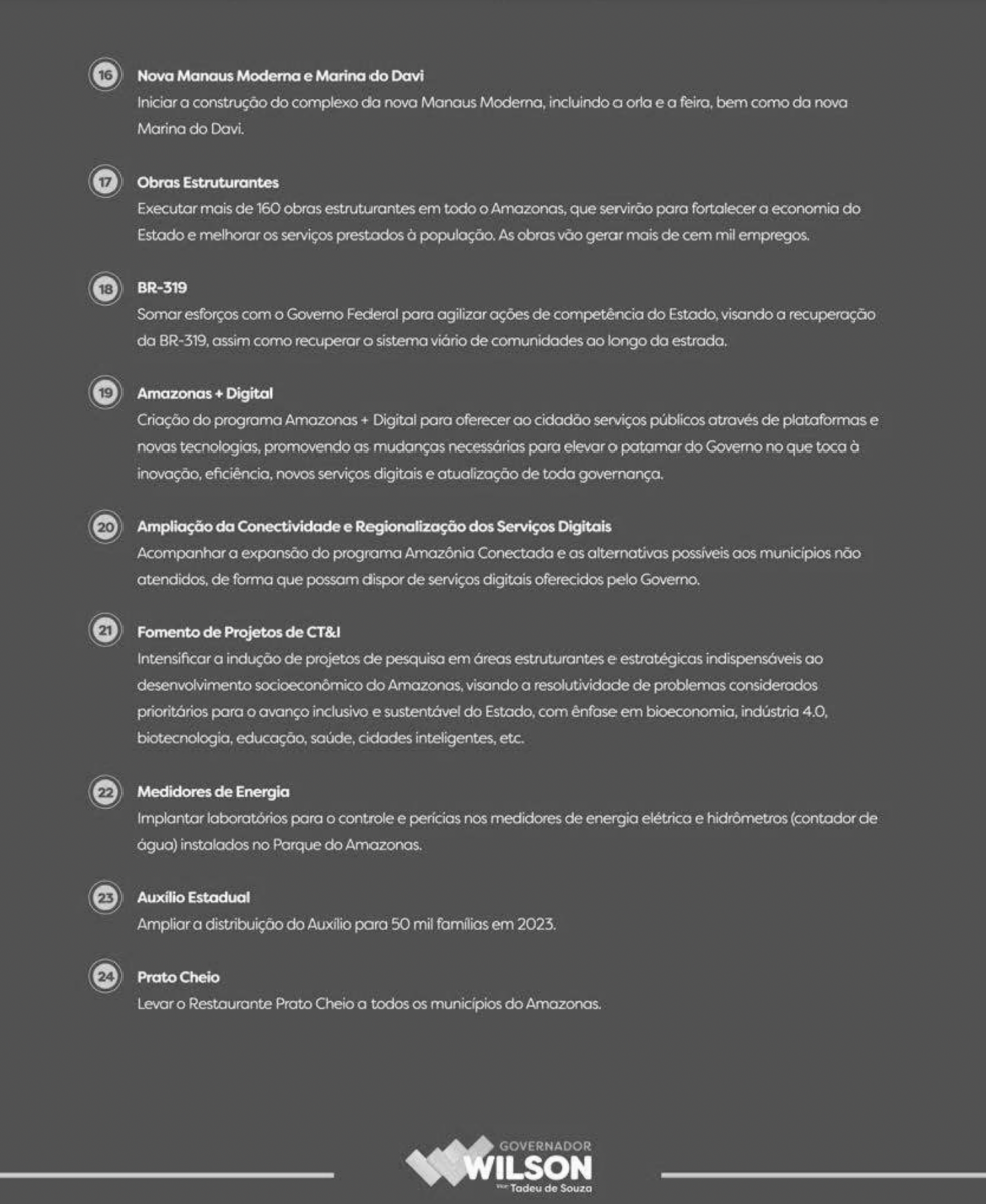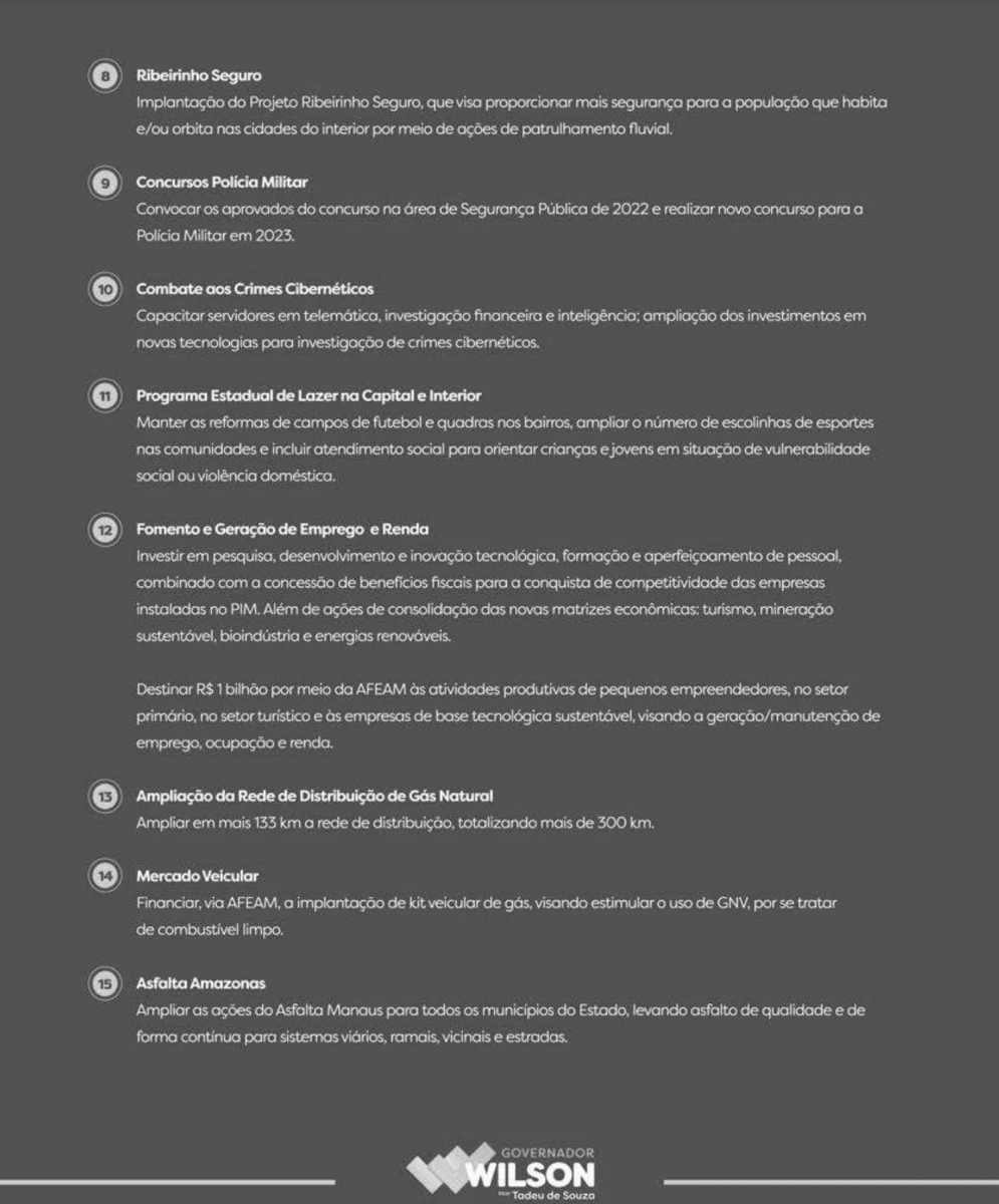 Entre as promessas que mais chamam a atenção é na segurança pública com a realização de um novo concurso público para a Polícia Militar em 2023, bem como, a convocação de aprovados no certame de 2022, mais investimentos tecnológicos no combate aos crimes cibernéticos e a criação do projeto Ribeiro Seguro, para patrulhamento fluvial em municípios do interior para combater os piratas dos rios do Amazonas.