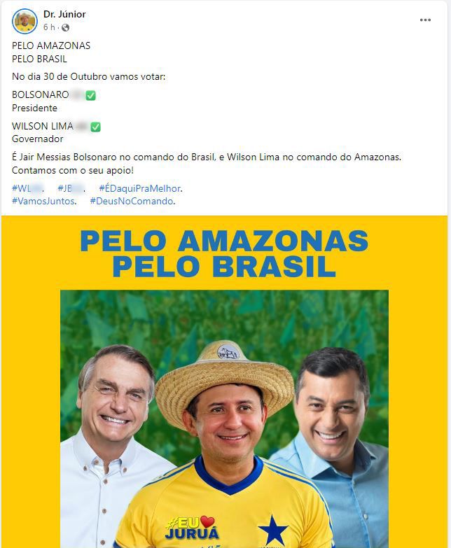 Na publicação, o ‘Dr. Junior’, como é mais conhecido no município, disse que: “É Jair Messias Bolsonaro no comando do Brasil, e Wilson Lima no comando do Amazonas. Contamos com o seu apoio!”.