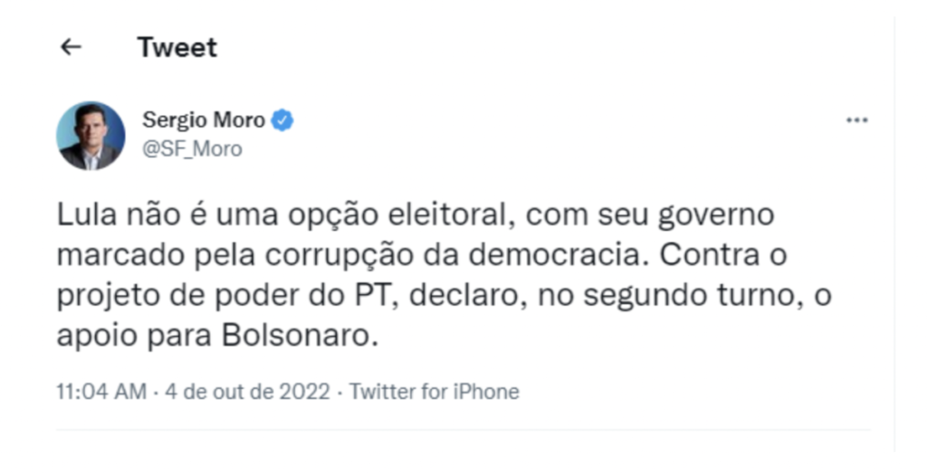 Moro, como se sabe, fez campanha no Paraná pedindo votos inclusive para Bolsonaro.