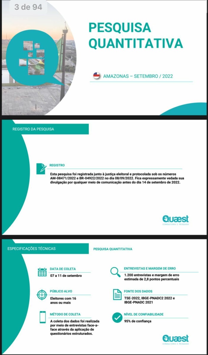 A pesquisa Quaest contratada pelo grupo Onda Digital foi registrada na Justiça Eleitoral sob o número AM-08471/2022 e BR-04922/2022, com a coleta de dados sendo realizada entre 7 e 11 de setembro. No total foram ouvidos 1.2 mil eleitores e a margem de erro estimada da pesquisa é de 2,8 pontos percentuais.