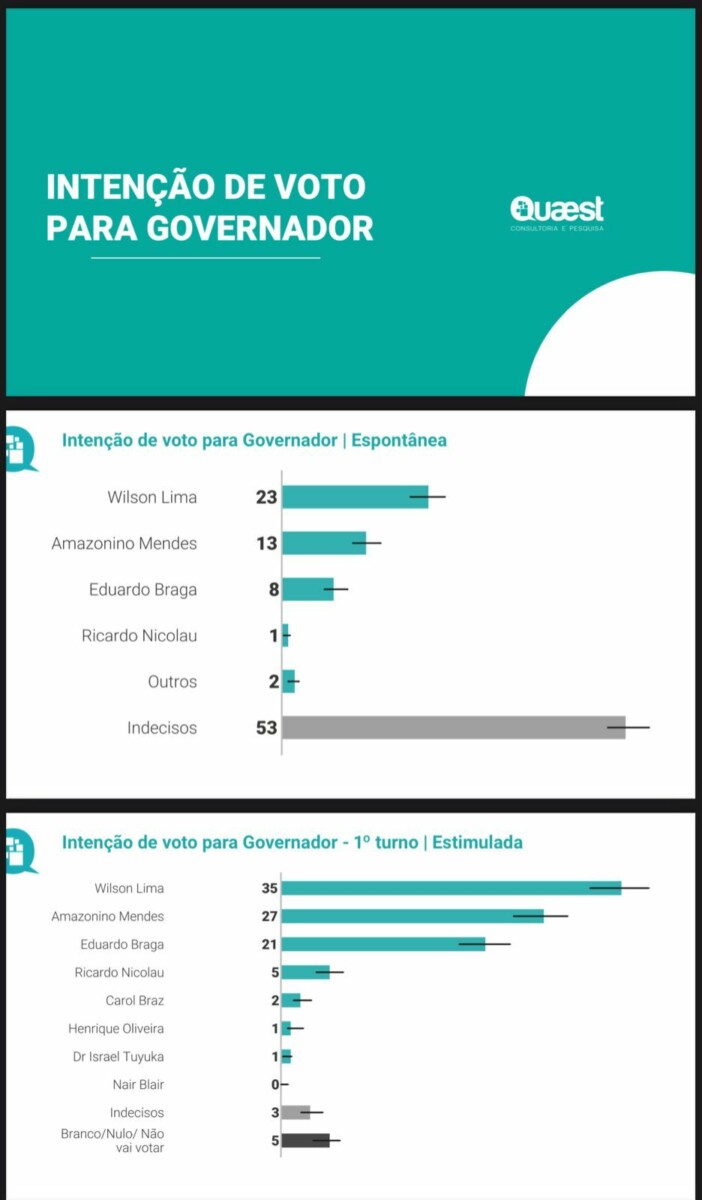 Manaus – A 18 dias para a realização do primeiro turno das Eleições 2022, o atual governador do Amazonas e candidato a reeleição, Wilson Lima (UB), lidera a disputa pelo cargo com 35% das intenções de voto, seguido por Amazonino Mendes (Cidadania), com 27%, em cenário estimulado, aponta uma nova pesquisa realizada pela Quaest Consultoria, contratada com exclusividade pela Rede Onda Digital, divulgada nesta quarta-feira (14).