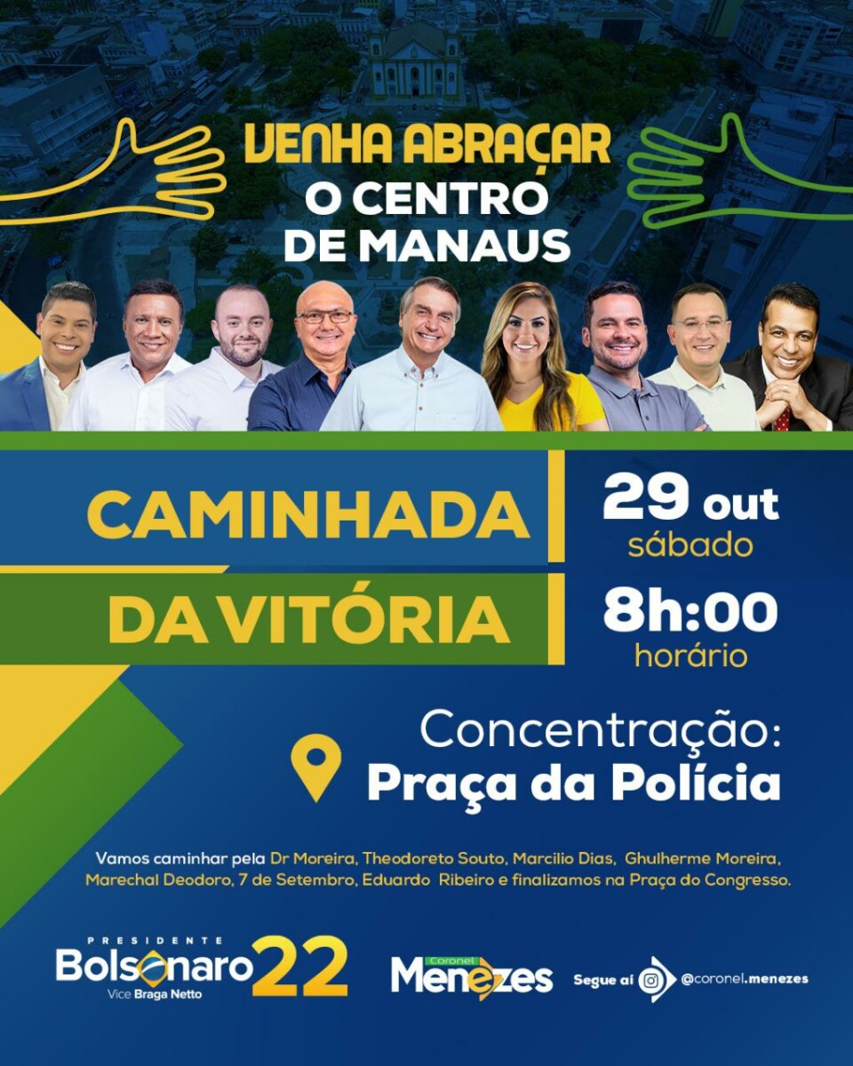 Manaus – O “Time Bolsonaro”, liderado por políticos bolsonaristas do Amazonas, vai comandar a caminhada da vitória programada para ocorrer neste sábado (29), no Centro de Manaus.