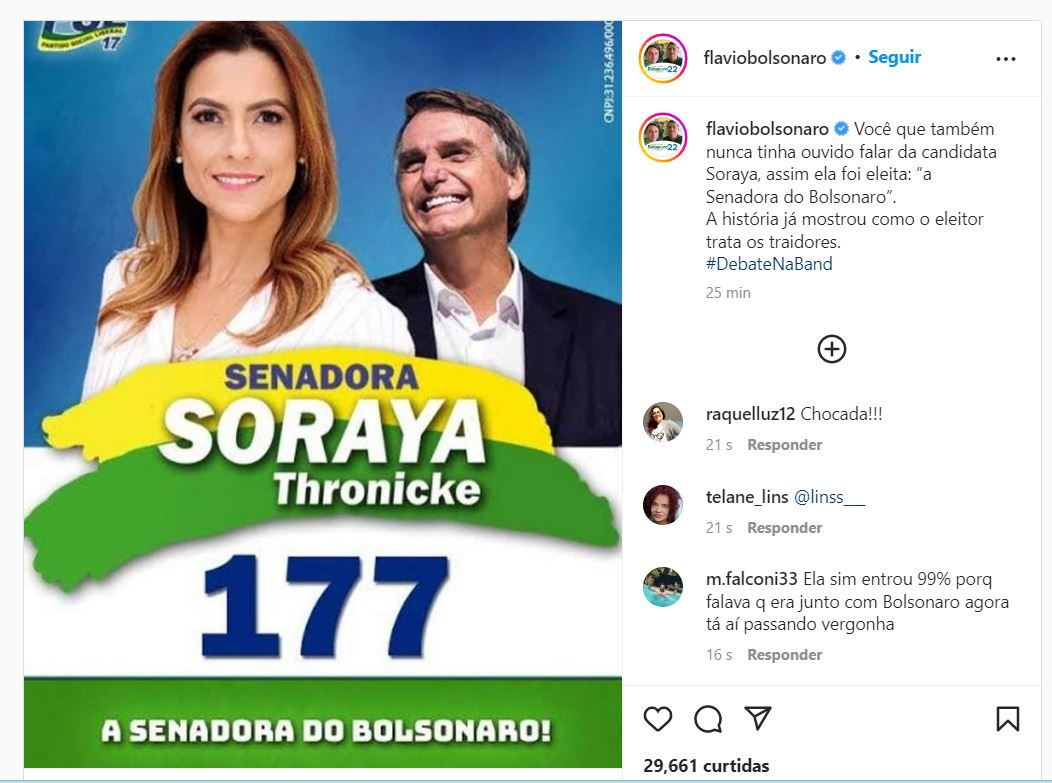 “Você que também nunca tinha ouvido falar da candidata Soraya, assim ela foi eleita: a Senadora do Bolsonaro. A história já mostrou como o eleitor trata os traidores”, escreveu o filho do presidente.