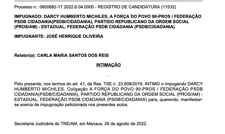 Agora, a relatoria na Justiça Eleitoral pediu nesta última sexta-feira (26) para que Beto Michiles se manifeste acerca da impugnação peticionada. Confira: