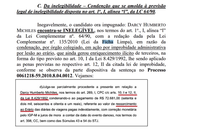 Humberto Michilis, ora Impugnado, foi acusado, julgado e condenado em primeira e segunda instâncias por atos de improbidade administrativa, enquanto gestor público, causando prejuízo financeiro ao Estado do Amazonas, tendo favorecido terceiros de forma direta com desvio de erário, através do uso excessivo de diários enquanto secretário, no valor de R$ 72.681,00, sendo condenado a ressarcir integralmente tais valores atinentes às diárias de viagem pagas indevidamente.