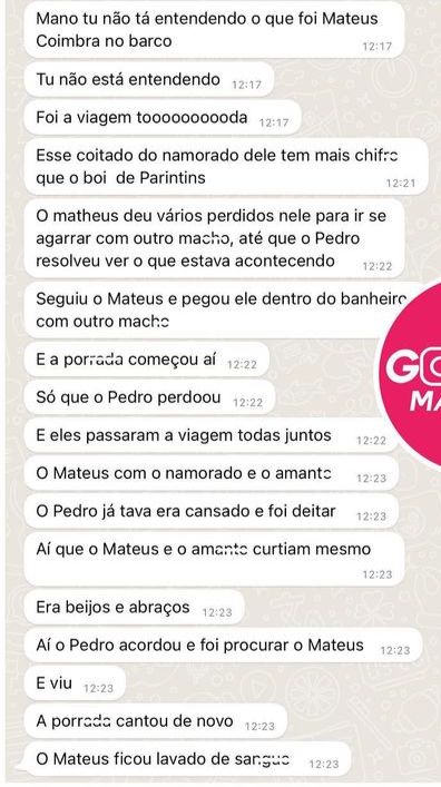 De acordo com as más línguas, o namorado de Matheus, apontado como Pedro, passou a viagem toda levando galhada e isso já tinha rendido várias brigas entre o casal.