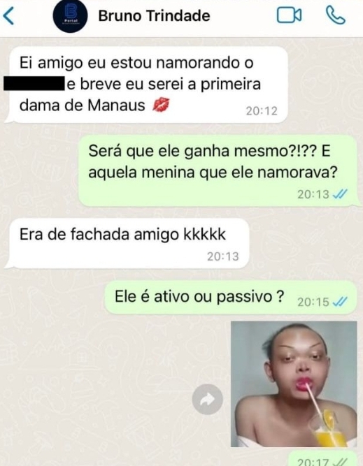 Mamaus – Em um print vazado nesta terça-feira (13), o blogueiro Bruno Tridnade aparece em uma conversa do WhatsApp, com um amigo, dizendo que estaria namorando um candidato à Prefeitura de Manaus.