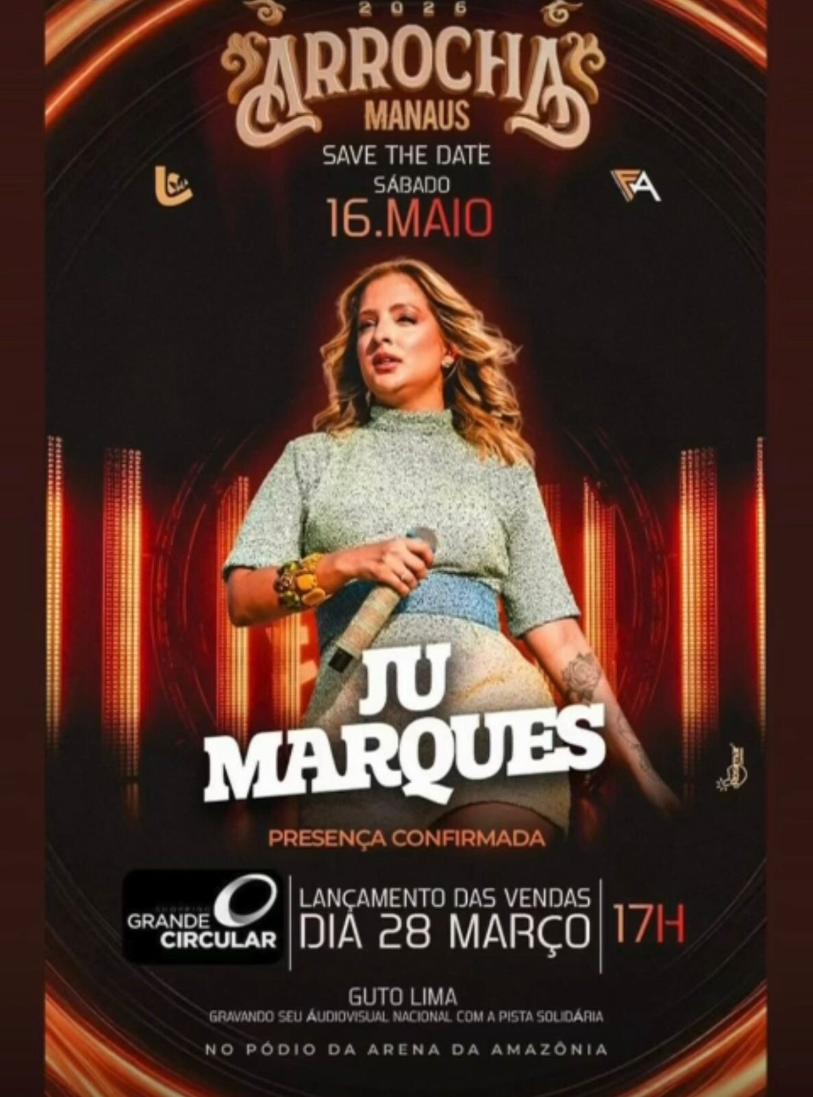 Manaus – O clima de festa já começa a tomar conta de Manaus com a confirmação do Arrocha Manaus 2026, que promete movimentar o calendário de eventos da capital amazonense. O festival está marcado para o dia 16 de maio, na Arena da Amazônia, reunindo grandes nomes do gênero, como a cantora Ju Marques e o artista Guto Lima.
