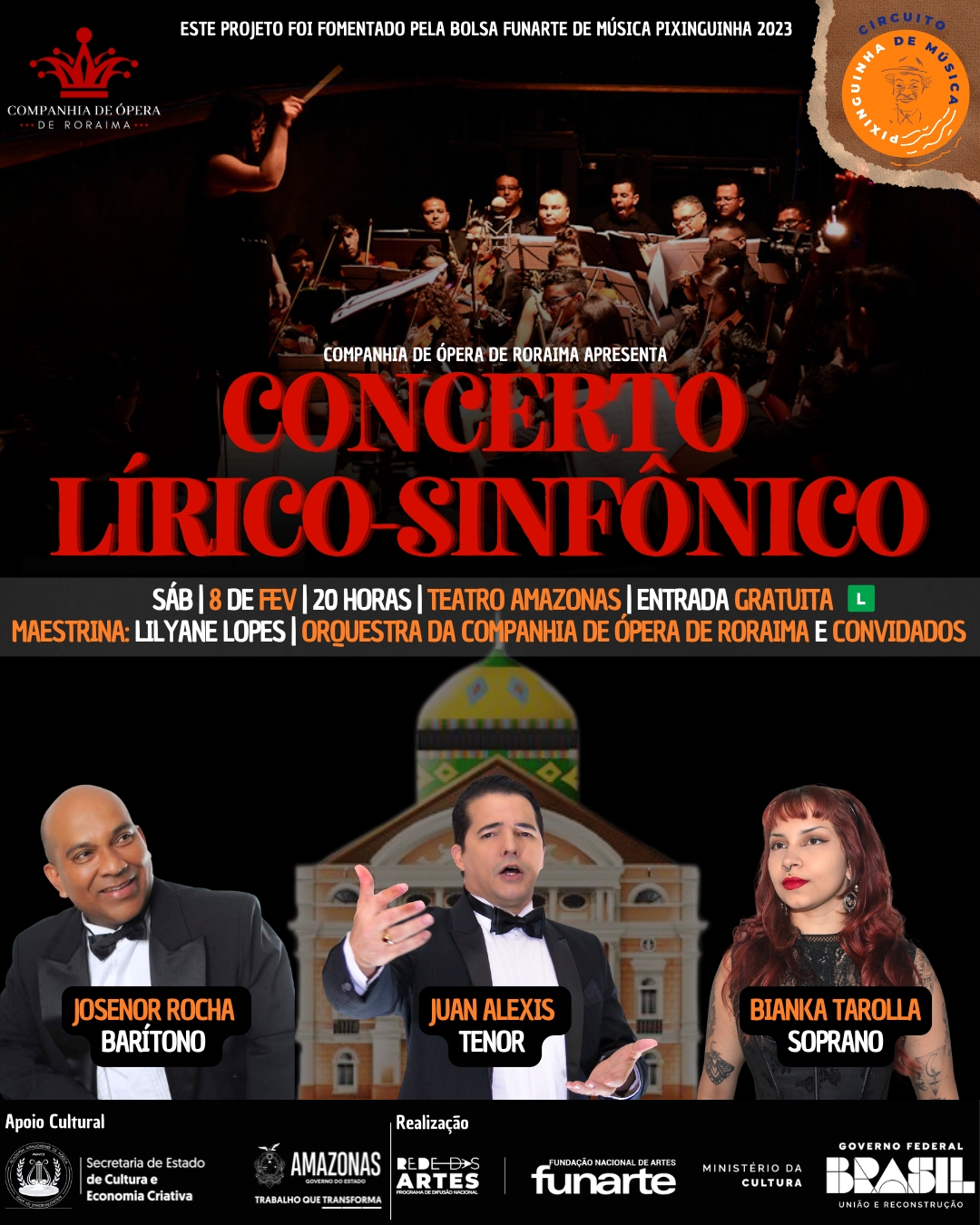 O projeto “Concerto Lírico-Sinfônico” é fomentado pela Bolsa Funarte de Música Pixinguinha 2023, por meio da Rede Artes, Funarte – Ministério da Cultura – Governo Federal. Possui ainda, o apoio cultural da Secretaria de Estado de Cultura e Economia Criativa do Amazonas – Governo do Estado do Amazonas, e também, do Sistema Encontro das Águas e da Academia Amazonense de Música.