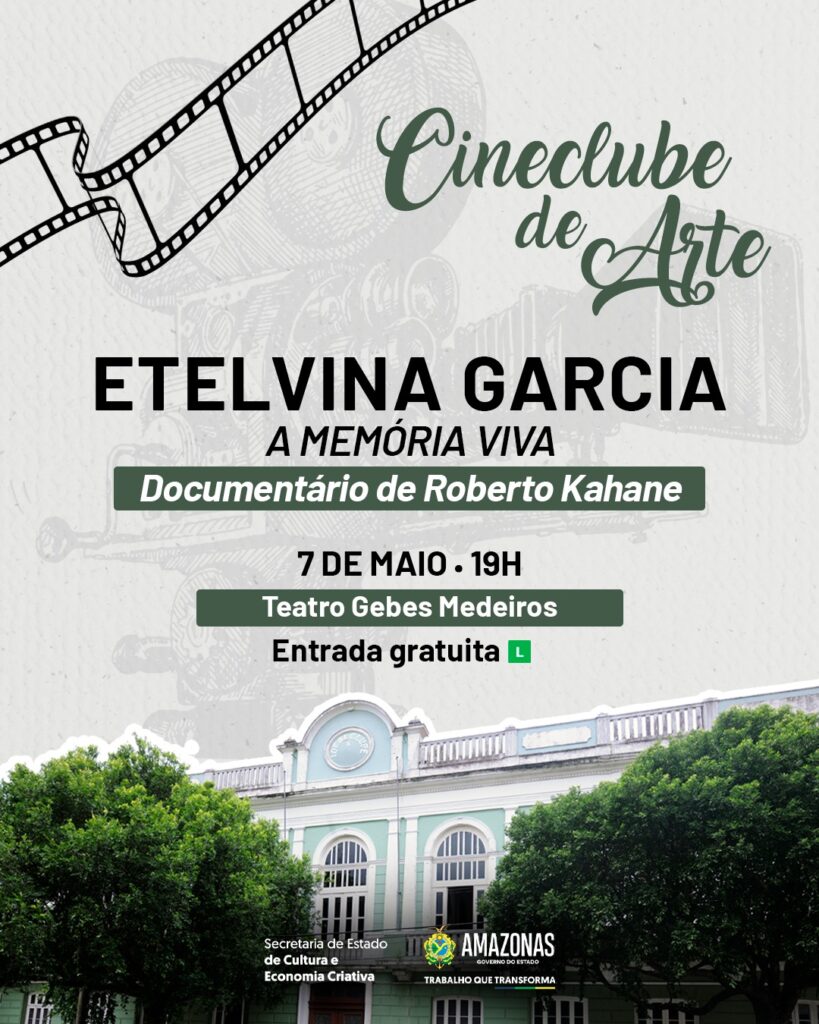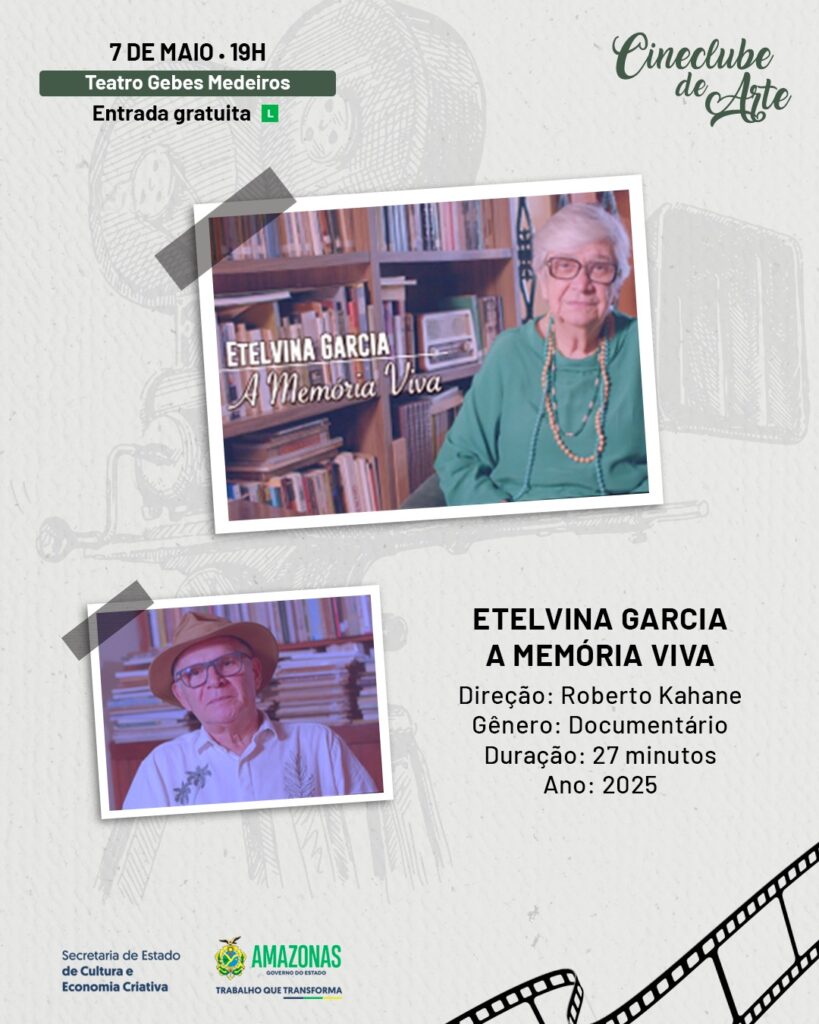 Manaus – Na próxima quarta-feira, 7 de maio, o Cineclube de Arte promove mais uma noite dedicada ao cinema produzido na região Norte, com a exibição gratuita do documentário Etelvina Garcia – A Memória Viva, do cineasta amazonense Roberto Kahane. O evento acontece no Teatro Gebes Medeiros, no centro de Manaus, a partir das 19h.
