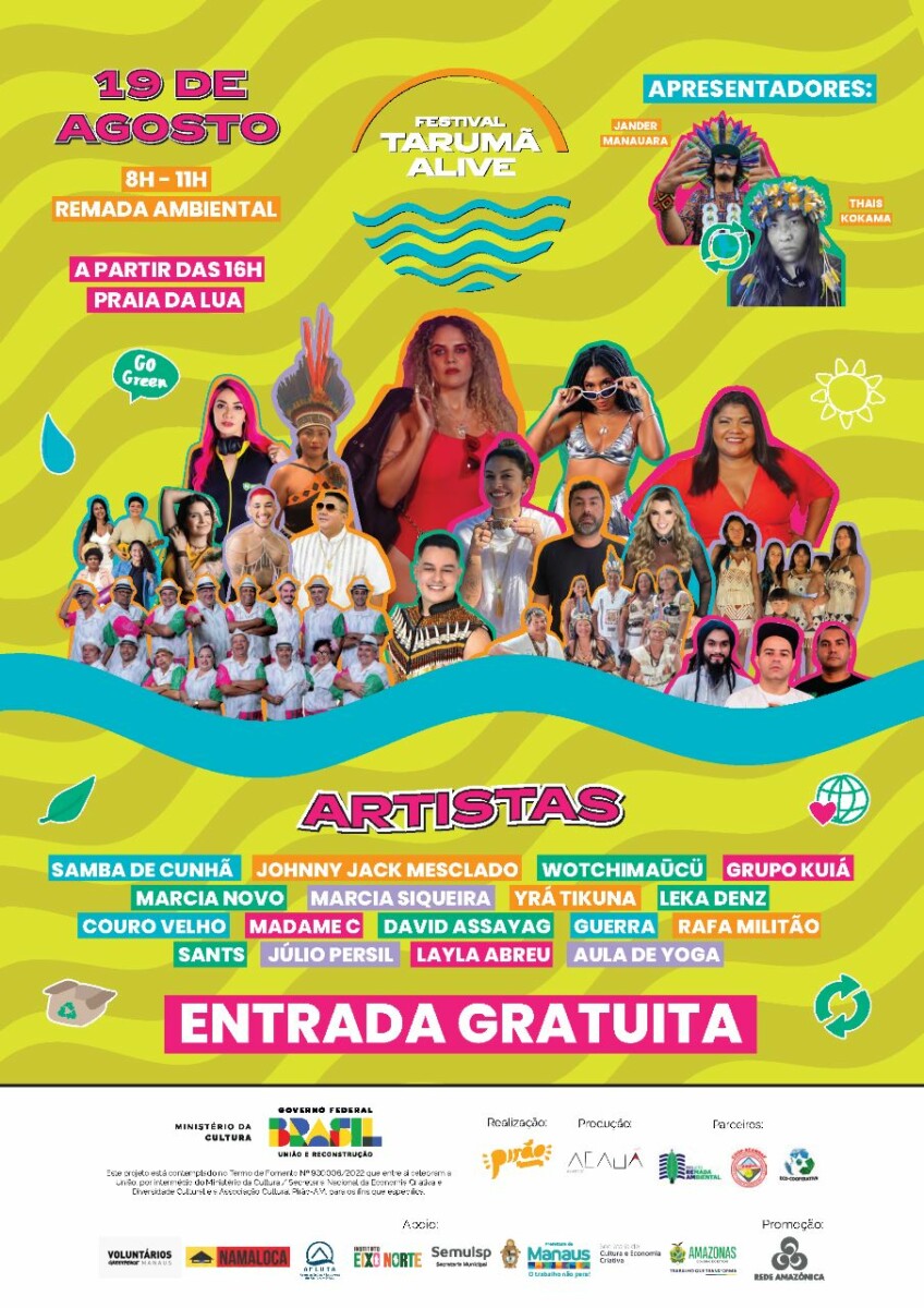 Manaus – Com 14 horas de programação, a 7ª edição do Festival Tarumã Alive acontece no próximo fim de semana, na Praia da Lua. O evento reúne ações ambientais e apresentações artísticas em prol da maior bacia hidrográfica urbana do Amazonas, a do Tarumã-Açú.