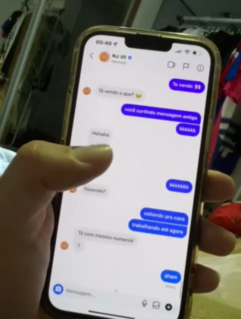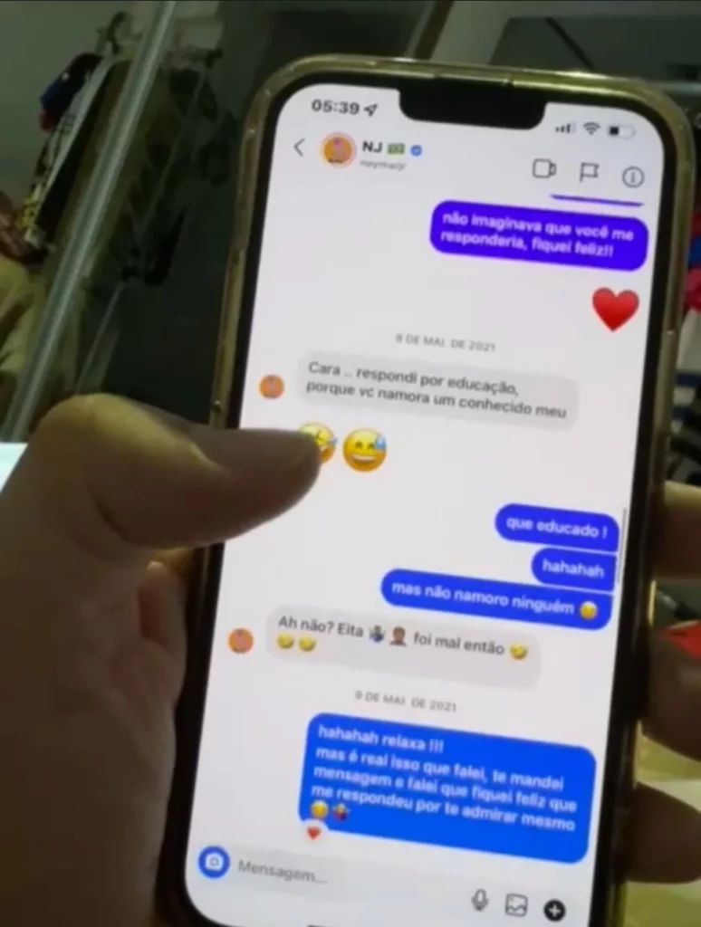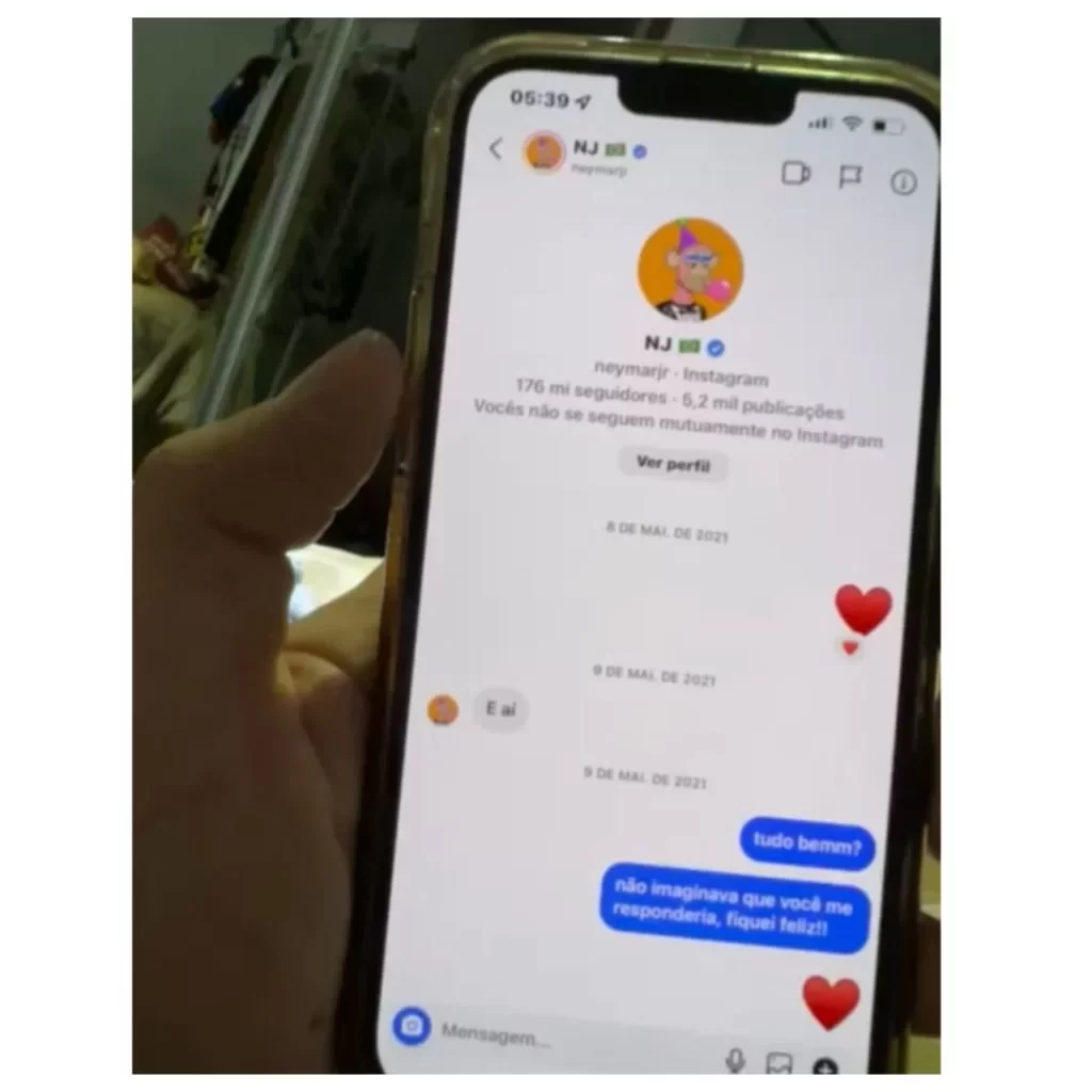 Então, Neymar esquiva: “Cara… respondi por educação, porque você namora um conhecido meu”, se referindo ao cantor. A influenciadora declara: “Que educado! haahahaha Mas não namoro ninguém”. Ela completa: “Mas é real isso que falei, te mandei mensagem e falei que fiquei feliz que me respondeu por te admirar mesmo”. O craque agradece pelo carinho.