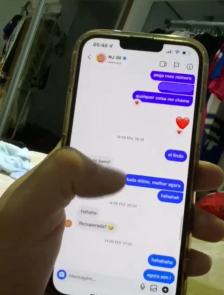 “Oi lindo!”, começa ela. Neymar pergunta se está tudo bem e a influenciadora diz: “Tudo ótimo, melhor agora hahaha. O jogador pergunta “Recuperada?” e ela diz “agora sim!”, em seguida Neymar deseja boa noite e diz que vai dormir. Esta coluna segue tentando entender, recuperada de quê?