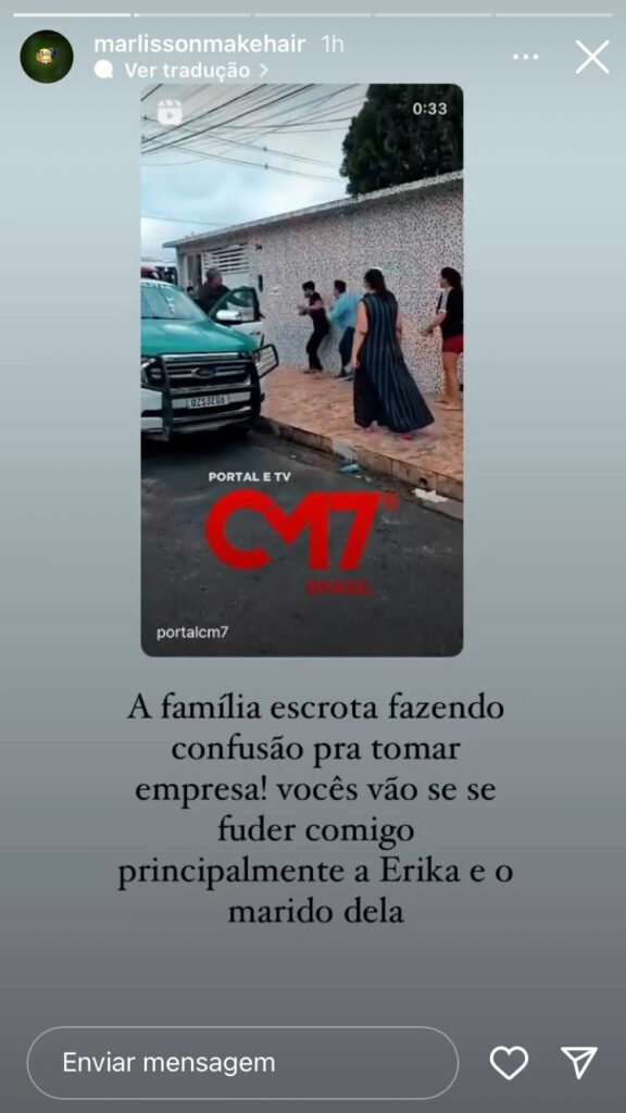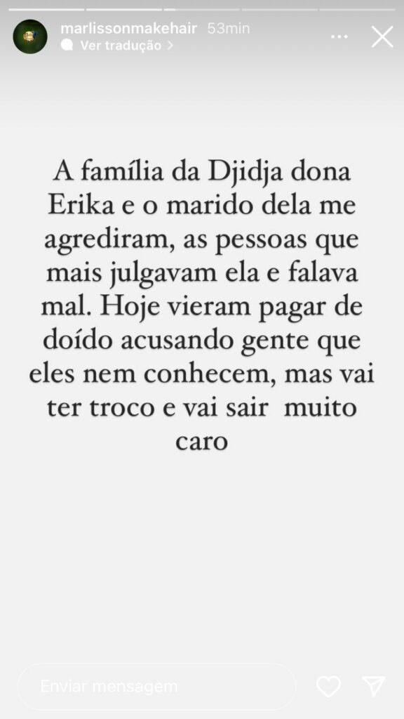 “A família escrota fazendo confusão para tomar empresa! Érika [familiar de Djidja] e o marido dela me agrediram (…) As pessoas que mais julgavam ela [Djidja] e falavam mal!”, disse.