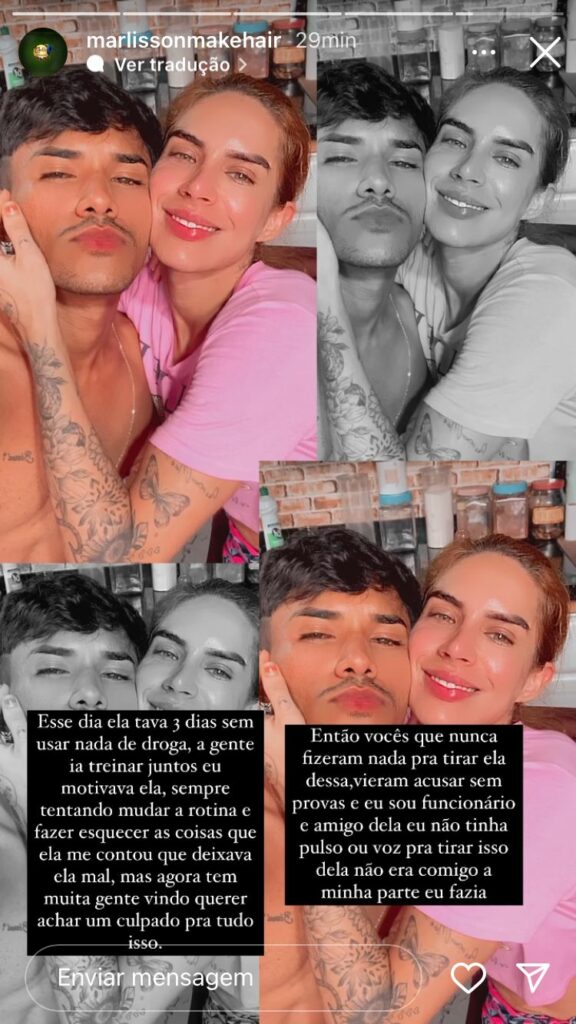 Ainda durante a declaração, Marlisson publicou uma foto com Djidja, confirmando que a empresária de fato passava por problemas com drogas. O amigo revelou que fez o que estava a seu alcance para ajudar Djidja, incluindo motivá-la a fazer exercícios físicos, além de mudar a rotina, para que ela esquecesse a tristeza que a levava ao uso de substâncias. No entanto, não cabia a ele determinar se ela ia abandonar o uso de entorpecentes. “A minha parte eu fazia”, disse.