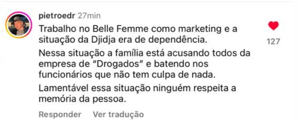 Nas redes sociais, ele alegou que, além de funcionário, era amigo de Djidja, e que os parentes dela que agora o acusam nunca gostaram de Djidja e eram o principal “gatilho” para a depressão severa pela qual a ex-sinhazinha passava.