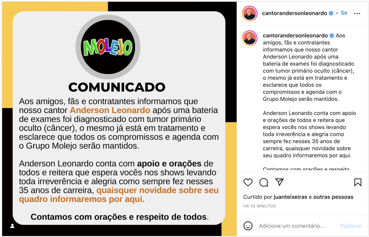 Brasil – Em publicação na página oficial do Grupo Molejo, foi anunciado que o cantor do grupo, Anderson Leonardo, foi diagnosticado com um tumor primário oculto (câncer). De acordo com o comunicado, o resultado saiu após uma bateria de exames.