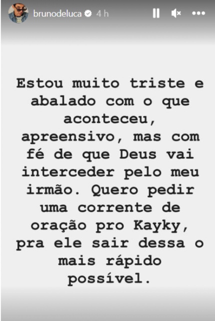 No Instagram, Bruno desabafou sobre o ocorrido na tarde deste domingo, 3. “Estou muito triste e abalado com o que aconteceu, apreensivo, mas com fé que Deus vai interceder pelo meu irmão. Quero pedir uma corrente de oração pro Kayky, pra ele sair dessa o mais rápido possível”, escreveu o apresentador do ‘BBB – A Eliminação’.