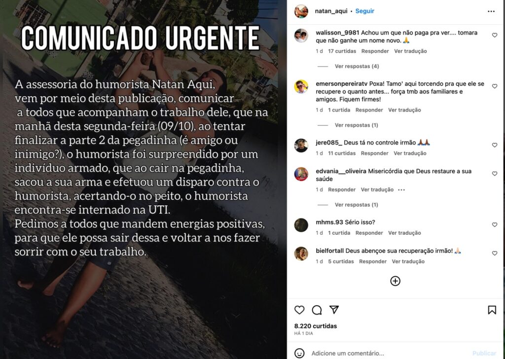 A equipe do humorista informou nas redes sociais que ele foi surpreendido por um suposto agressor armado, que teria sacado a arma e efetuado um disparo após cair na pegadinha. A assessoria relatou que Natan estava na UTI, mas seu quadro de saúde era estável.