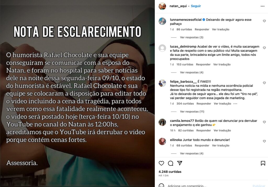 No entanto, a polêmica tomou proporções ainda maiores quando outro humorista pernambucano, Rafael Chocolate, se ofereceu para editar o vídeo com a equipe de @natan_aqui e postar o material, incluindo a cena da falsa fatalidade, no YouTube no dia seguinte.