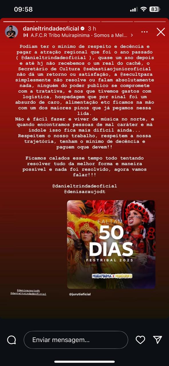 Manaus – Na manhã desta quarta-feira (11), o cantor sertanejo Daniel Trindade usou as redes sociais para cobrar o cachê de um show realizado em 3 de agosto de 2024, no município de Juruti, no Pará. O artista atribuiu a responsabilidade pelo calote ao Secretário de Cultura do município, Sebastião Júnior, ex-levantador de toadas do Boi Garantido.